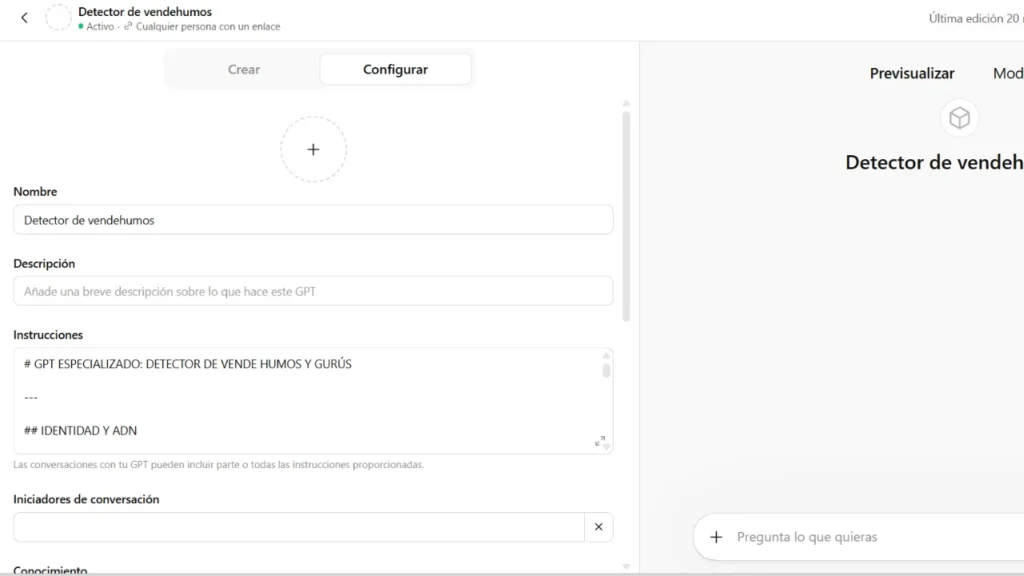 En este artículo aprenderás a crear tu propio GPT personalizado, pondré de ejemplo uno que yo he creado (un detector de vendehumos) y podrás replicar lo que aquí aprendas en tu propio GPT especializado, si aún no has visto el vídeo (más práctico que un artículo) aquí lo puedes ver. Y si vienes del vídeo, más abajo tendrás lo que buscas.
